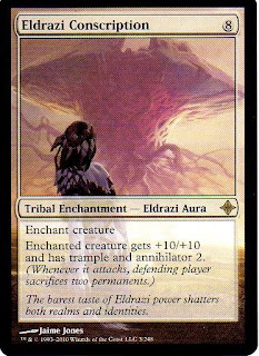 A criatura encantada recebe +10/+10 e tem atropelar e aniquilador 2. (Toda vez que esta criatura ataca, o jogador defensor sacrifica duas permanentes.)